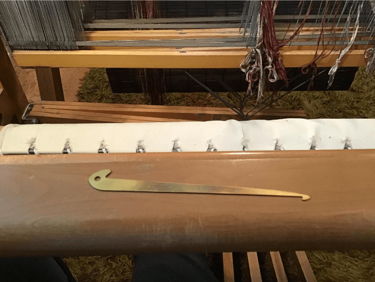 The image to the left shows a Harrisville brass threading and sleying hook. Once in my hand it does not get put down (unless I drop something) instead it gets pinched between my thumb and index finger which means I can use my hand to help select heddles and get the next set of threads positioned in my left hand – all without putting the hook down.